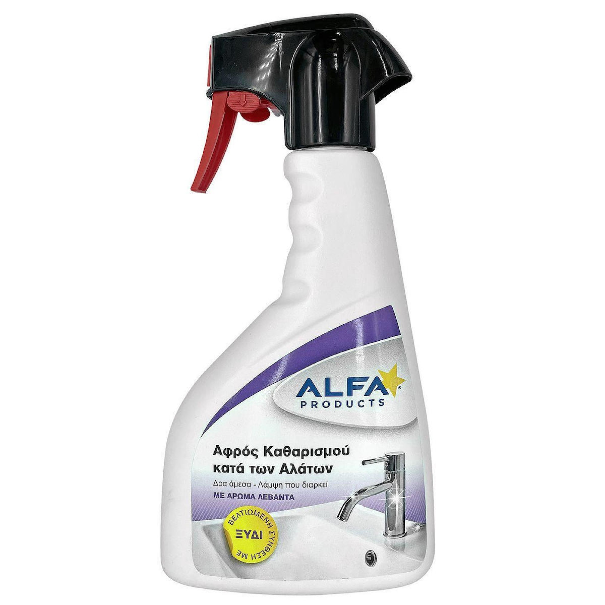 Καθαριστικό spray της εταιρείας Alfa Products, που αφαιρεί άλατα, υπολείμματα σαπουνιού και στίγματα νερού από τις επιφάνειες του μπάνιου και ταυτόχρονα τους χαρίζει ένα ευχάριστο άρωμα.